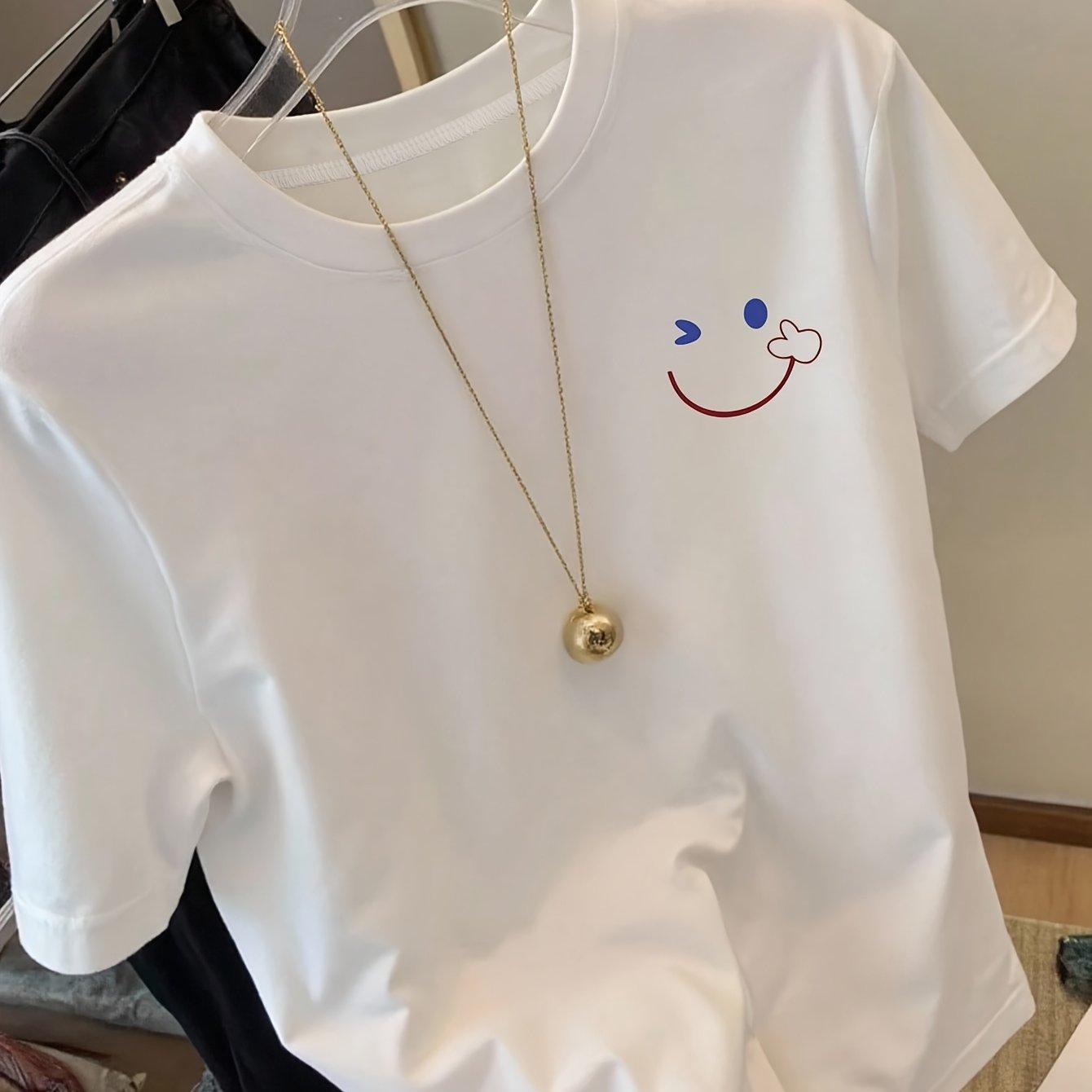 TEMU 여성용 기쁨의 얼굴 프린트 라운드넥 반팔 캐주얼 티셔츠