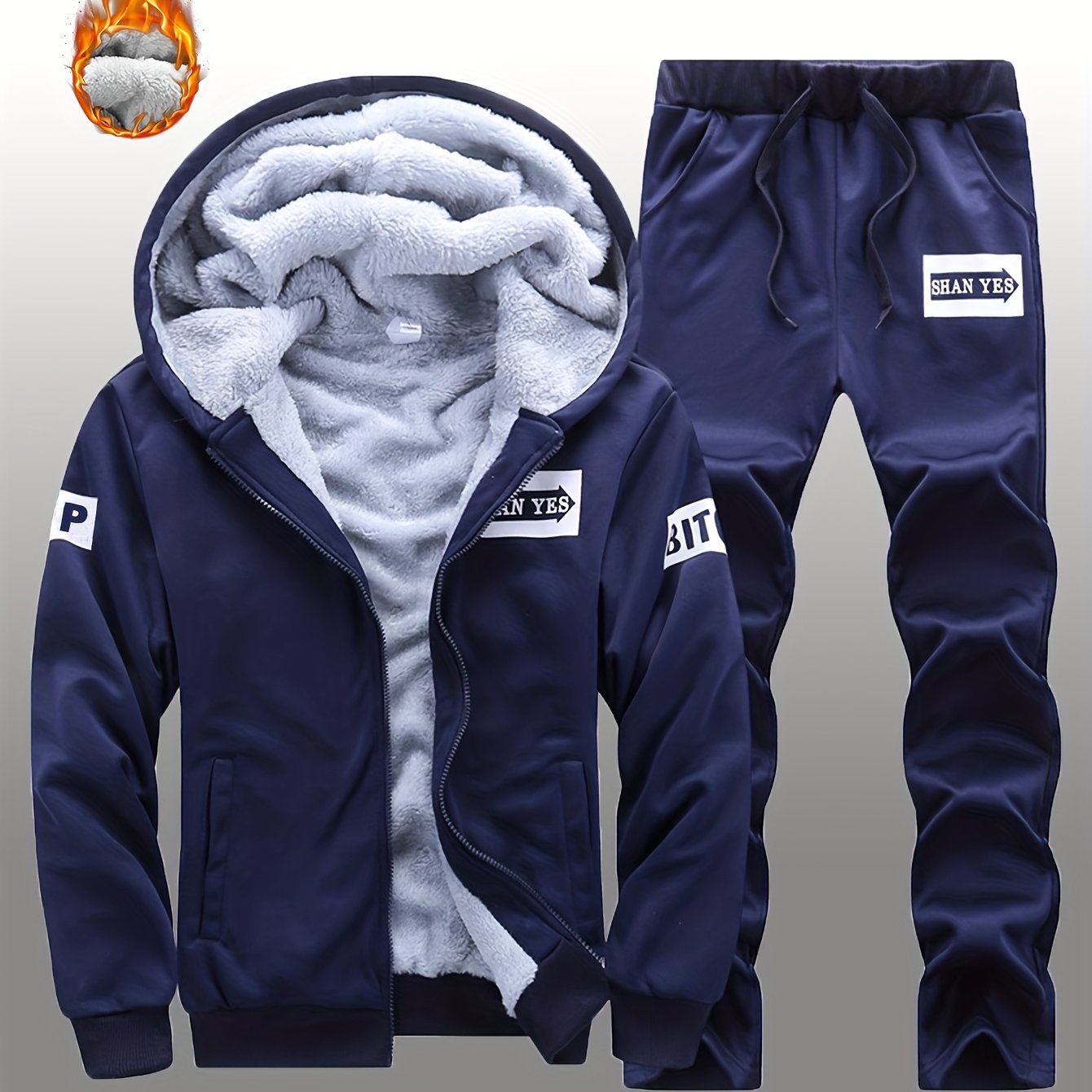 TEMU 남성용 겨울용 플리스 안감 후드 재킷 & 조거 세트 - 따뜻하고 두꺼운 스타일리시한 운동복