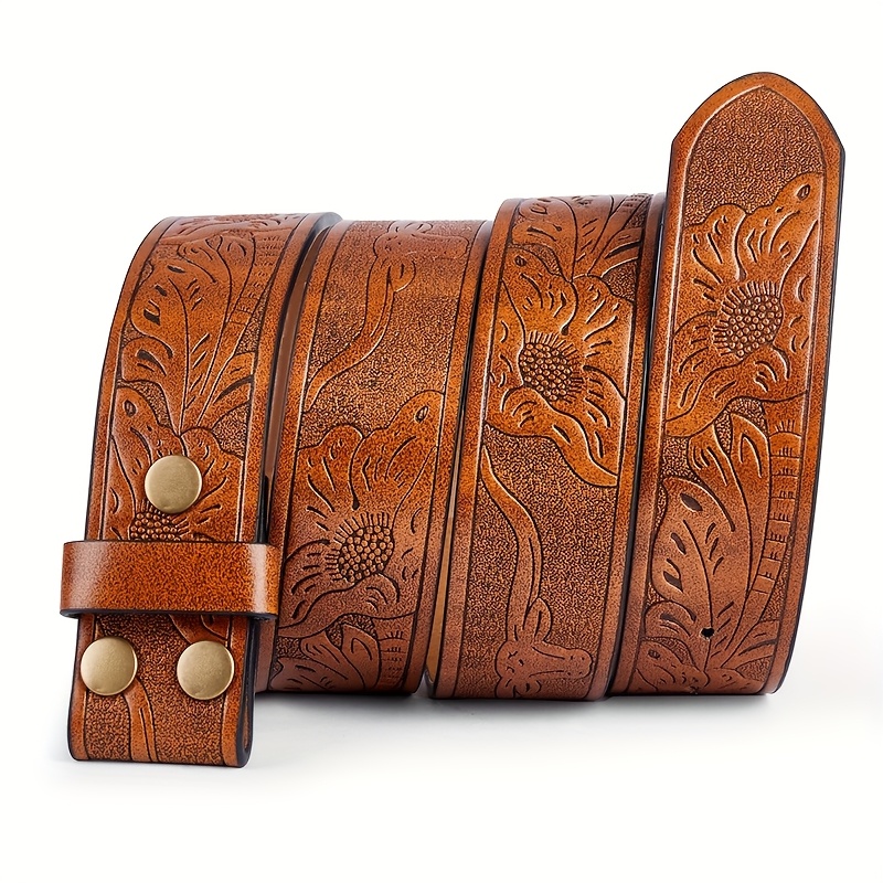 TEMU 남녀공용 웨스턴 벨트 - 빈티지 인조 가죽 소프트 벨트, 웨스턴 스탬프 프레스 디자인, 1.5인치 폭 버클 없는 벨트 (청바지 & 기어용) - 미디엄 사이즈, 웨스턴 댄스, 목장, 캐주얼 웨어용 고품질