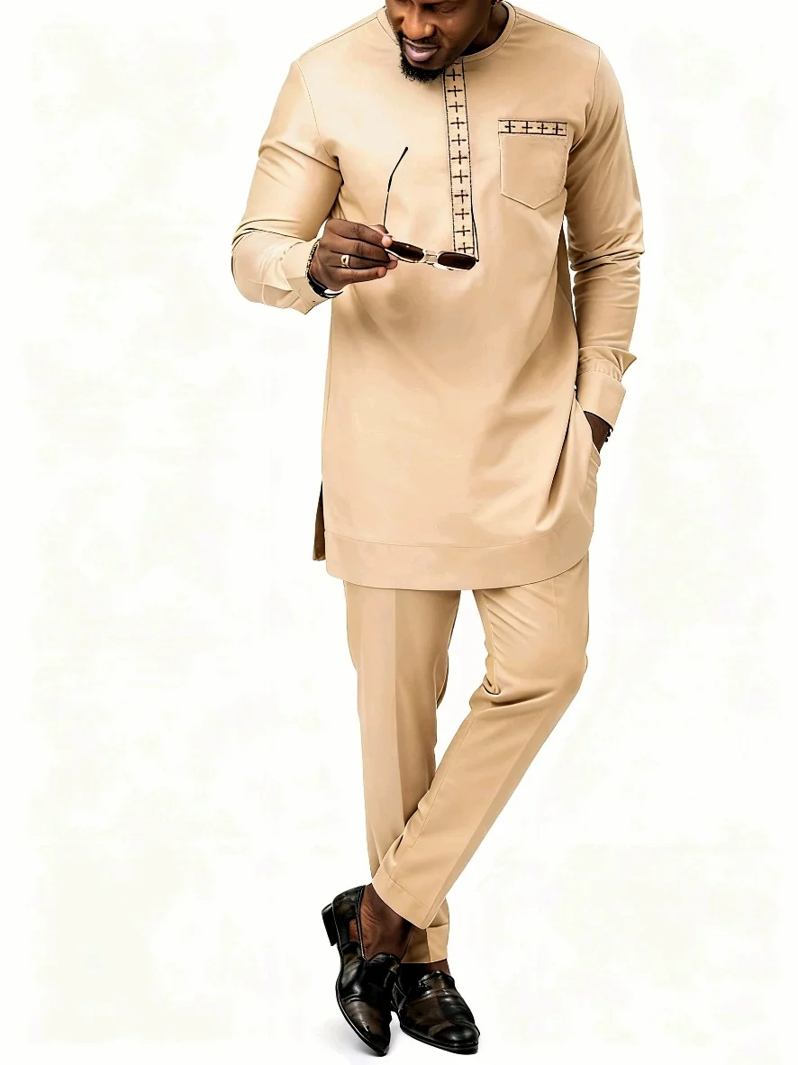 2025 남자의 우아한 긴 소매 정장 셔츠 바지 2 피스 라운드 넥 스티치 솔리드 컬러 파티 긴 소매 아프리카 민족 스타일