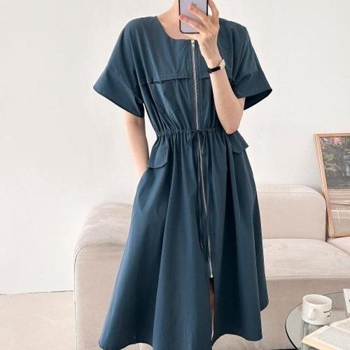 지퍼 카라 랩스커트 스타일 캐주얼 반팔 원피스