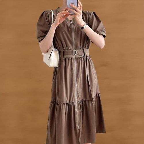 |CDO53FF|여성 미니멀 브이넥 지퍼 허리띠 반팔 셔링 롱 드레스