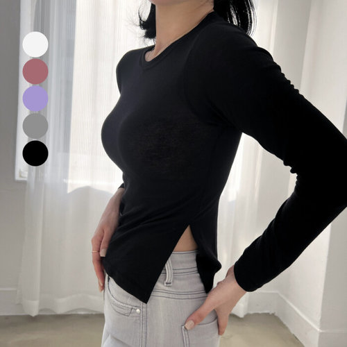 구디프 여성용 여리핏 슬림 딥유넥 라운드 슬릿 기본 긴팔티