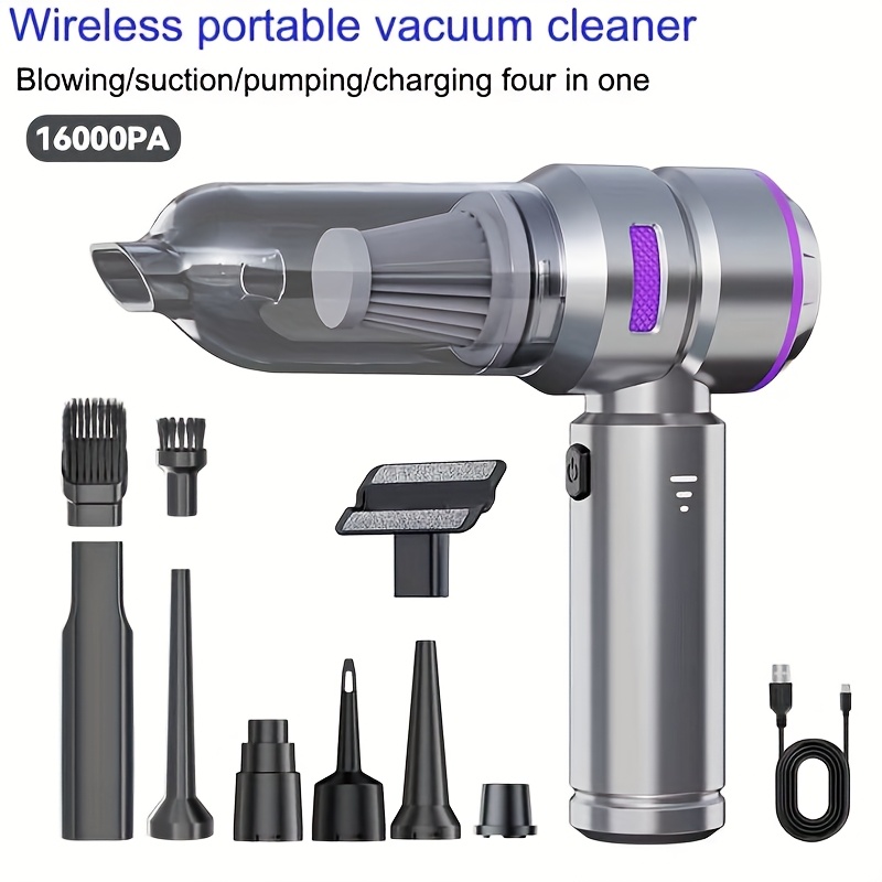 TEMU 4-in-1 휴대용 핸드헬드 진공 청소기, 16KPa 강력한 흡입력, LED 전원 표시등, 3단계 조절 가능한 강도, 브러시리스 모터, USB 충전식, 가정 및 차량 사용에 적합, 자동차 진공 청소기