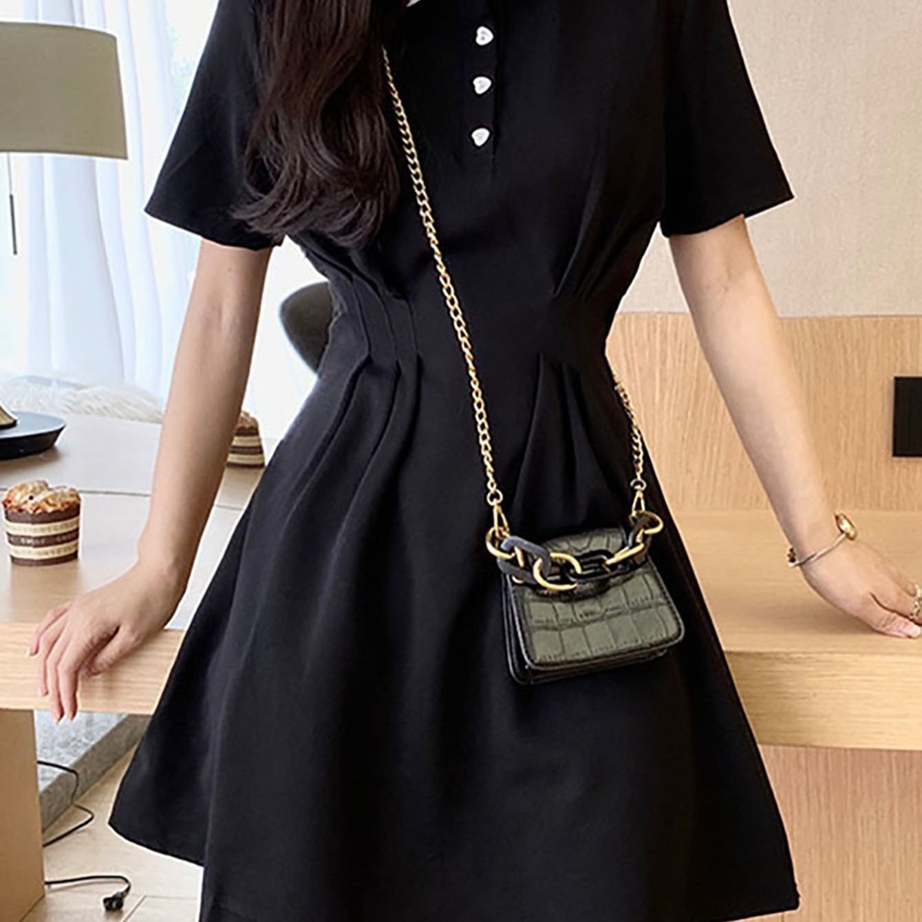 TEMU 여성 여름 심플 컴포트 슬림핏 솔리드 통기성 얇은 셔링 미니 원피스 데일리 날씬해 보이는 캐주얼 카라 반팔 스커트 슬림소녀 SLIM GIRL