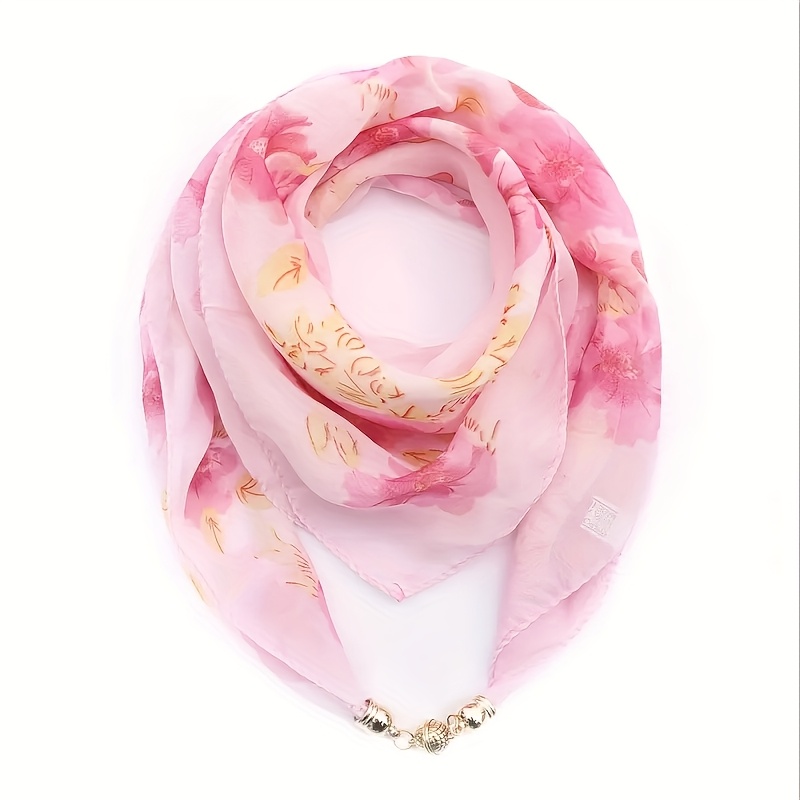 TEMU 플로랄 스퀘어 스카프 자석 클라스프 - 여성용 가벼운 폴리에스터 넥 랩, 핑크 & 골드 악센트, 캐주얼 및 프로페셔널 의상에 다용도, 따뜻하고 통기성 좋은 패션 액세서리, 우아한 디자인