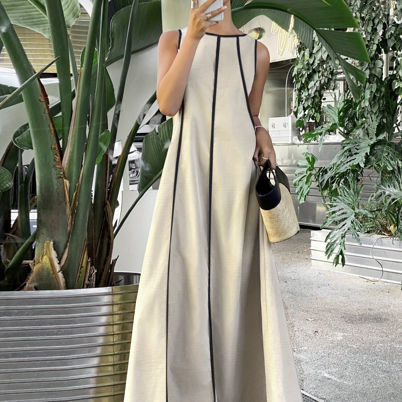 TEMU 여성용 우아한 베이지 & 블랙 대비 드레스 - 파티, 사무실, 휴가용 긴 포멀 캐주얼 가운 - 세탁기 사용 가능 논스트레치 파티 원피스