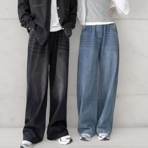 남녀공용 핀턱 스냅 버튼 와이드 데님 팬츠 밴딩 청바지 WFKQ1LH
