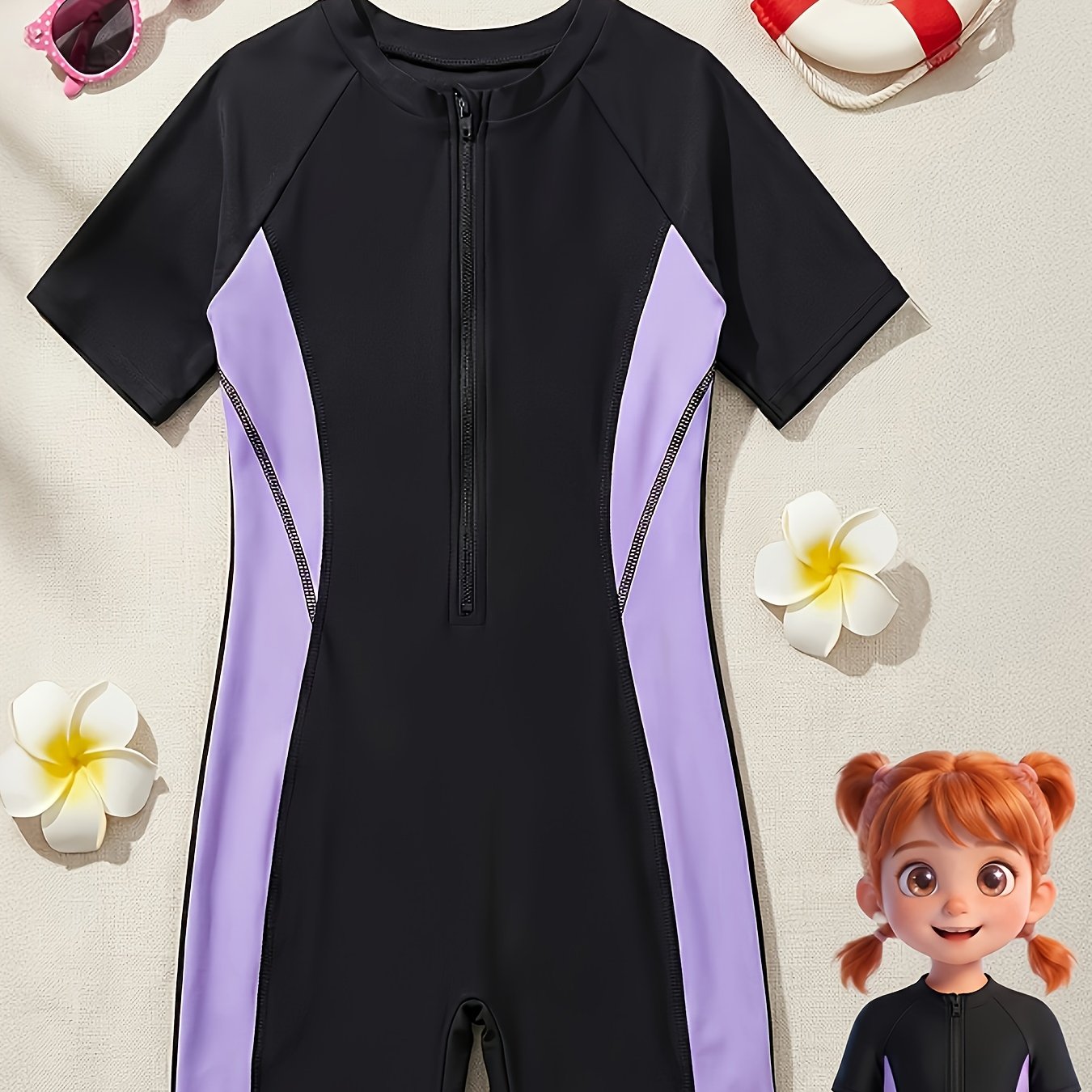 TEMU 청소년용 블랙 & 퍼플 원피스 수영복