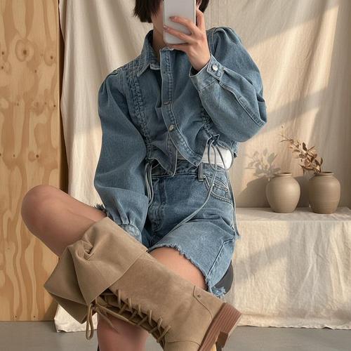 크롭청자켓 여름 여자데님코디 퍼프 반팔 재킷