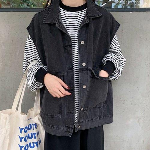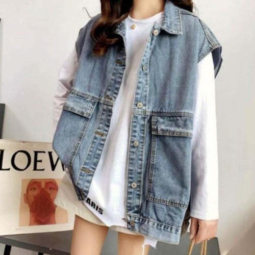 오버핏 민소매 포켓 청자켓 여자 레이어드 데님 조끼 베스트