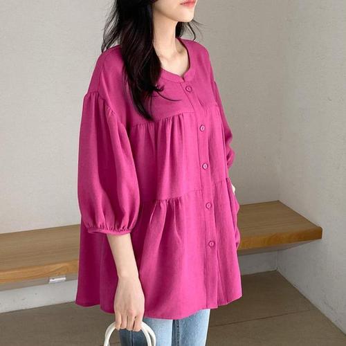 [다잇템]여자 라운드 잔주름 티어드 체리핑크 블라우스 (14333845A)