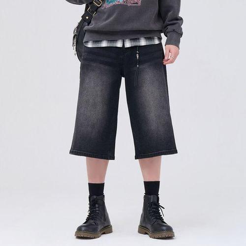 [체이스컬트]공용 블랙 버뮤다 와이드 데님 팬츠-EERU2332B03