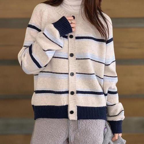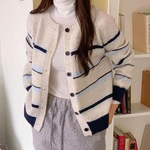 [신상오픈런]여성 여리핏 컬러 배색 스트라이프 라운드넥 울 니트 가디건