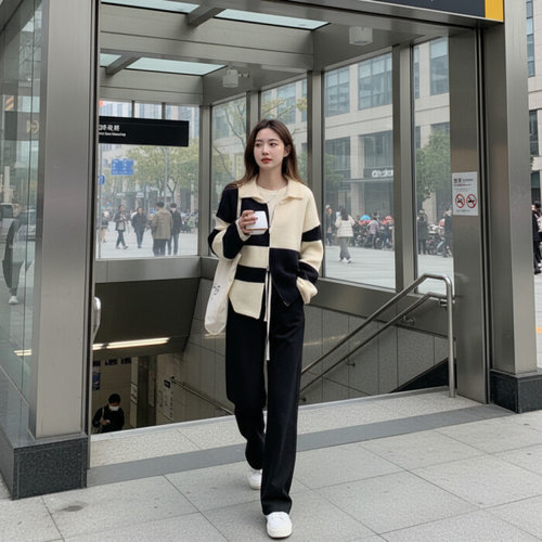 [신상오픈런]여성 여리핏 배색 스트라이프 라운드넥 니트 가디건