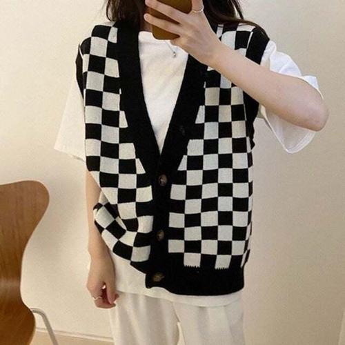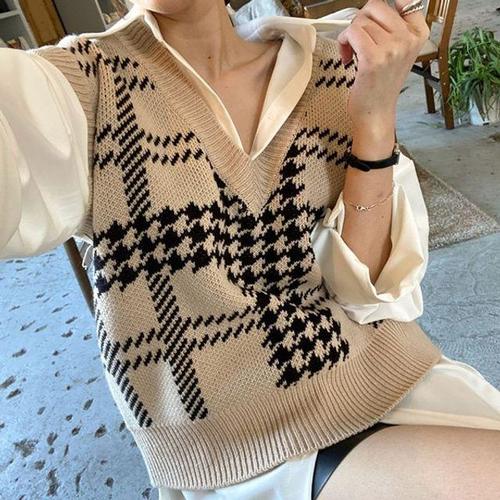 [셀럽하우스]V넥 YUSZ9082 인기 체크 루즈핏 니트 베스트 여성 조끼 바둑무