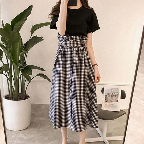 [셀럽하우스]여자 AWIF3697 여름 데이트 룩 체크 롱 스커트 반팔 티 세트