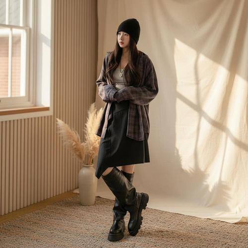 [다잇템]여자 언발 박시 후디 가을체크셔츠 박시핏 셔츠 (18625339A)