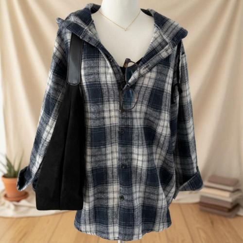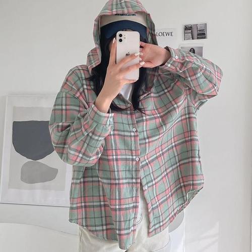 [옷자락]여성 캐주얼 체크 후드 셔츠