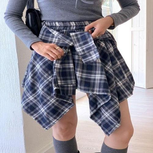 [셀러허브_여성트랜드패션]ONM 4타입 레이어드 미니스커트 체크셔츠 스타일 숏치