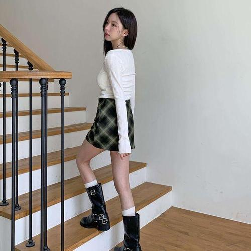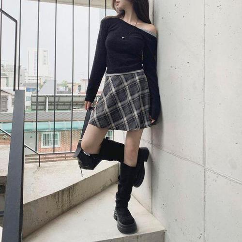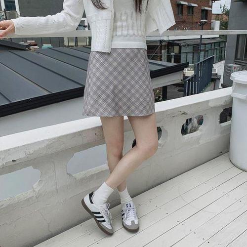 여자 가을 데이트룩 블린 체크 A라인 미니스커트