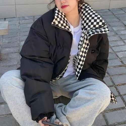 캐주얼 여성용 겨울 잠바 숏 체크 패딩 루즈핏 하이넥 여자 패딩 점퍼 추동 여성 긴팔 아우터 QXX