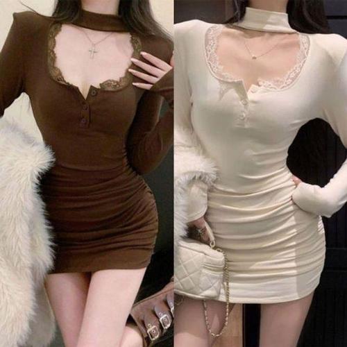 [에이치플러스몰]초커넥 레이스 슬림 셔링 원피스