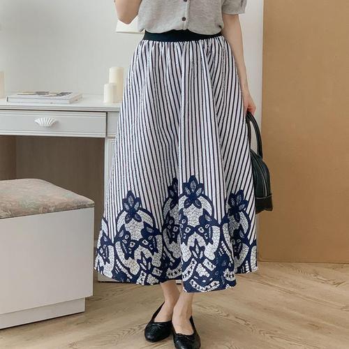[다잇템]여자 여름하객룩 고무줄 단가라 패턴 롱스커트 (15728050A)
