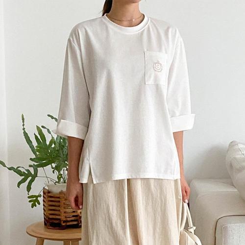 [옷자락]여자 4컬러 컨템포러리 컷아웃 크로쉐 주머니 SS 칠부반팔 티셔츠