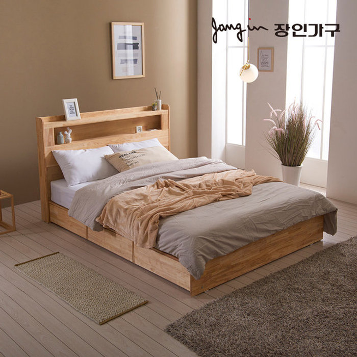 장인가구 [비밀특가] 플랫 베이직 LED 고무나무 원목 수납침대 본넬매트 Q,착불