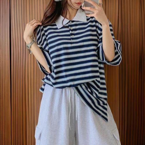 [신상오픈런]여성 루즈핏 카라넥 스트라이프 반팔 티셔츠와 카고 숏팬츠 세트