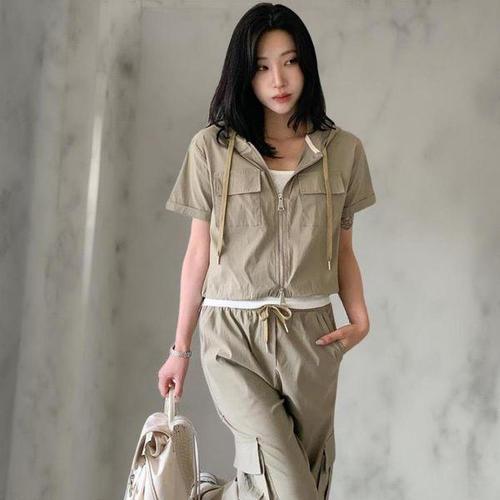 [옷자락]여성 크롭 후드 반팔 집업 카고 팬츠 세트
