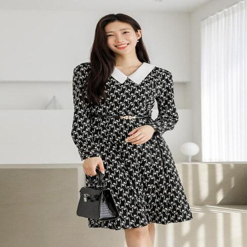 [시크라인] (~XXL까지) 판테라 배색 숄카라 벨티드 플레어 원피스 봄,가을 하객룩 오피스룩 격식룩 데이트룩