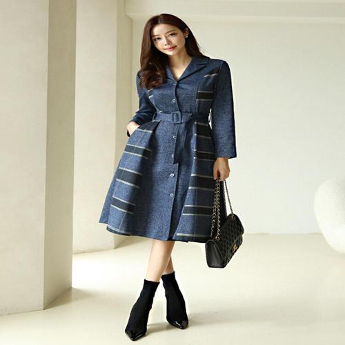 [스타일온미][스타일온미] 모넨 사이드 체크 배색 벨티드 데님 카라 롱 플레어 원피스