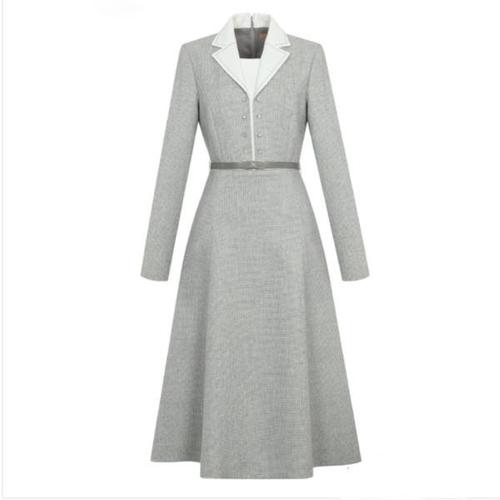 [시크라인] (~XXL까지) 프레트 카라 배색 플레어 원피스 봄 가을 투피스인듯 하객룩 오피스룩 모임룩 격식룩 빅사이즈