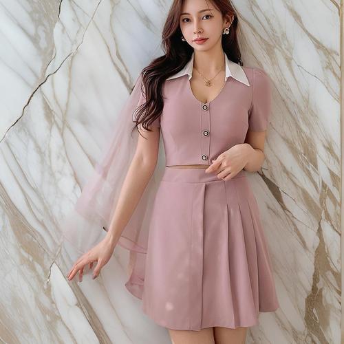 [옷자락] 여자 슬릿 반팔 플리츠 배색카라 미니원피스