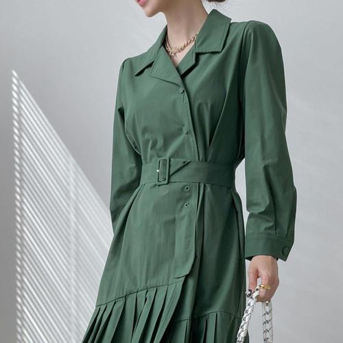 [옷자락] 여자 오피스룩 카라넥 허리벨트 플리츠 롱 원피스