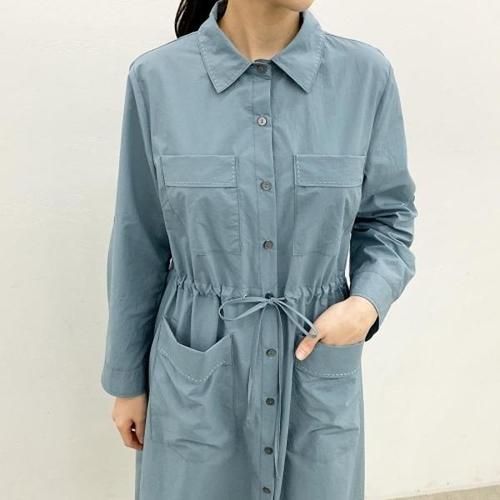 여성 카라 셔츠 포켓 스트링 면 코튼 롱 원피스