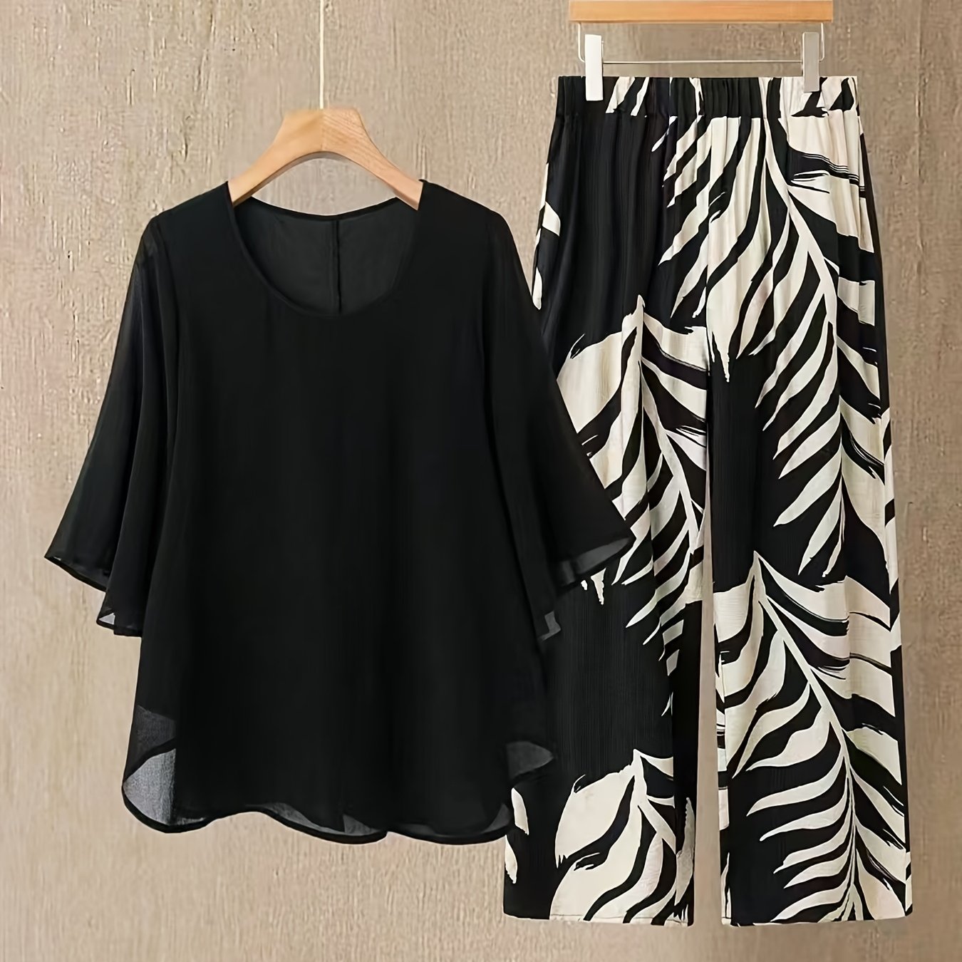 TEMU 여성용 우아한 플로럴 프린트 롱 팬츠와 블랙 앤 화이트 프린팅 디자인의 솔리드 컬러 민소매 라운드넥 탑, 다양한 행사 및 계절에 어울리는 휴가 외출과 캐주얼 웨어, 일상 스타일링 완벽
