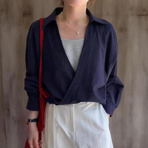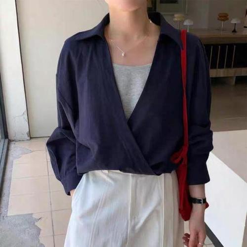 [신상오픈런]여성 레이어드 랩 카라 긴팔 셔츠 나시 스타일