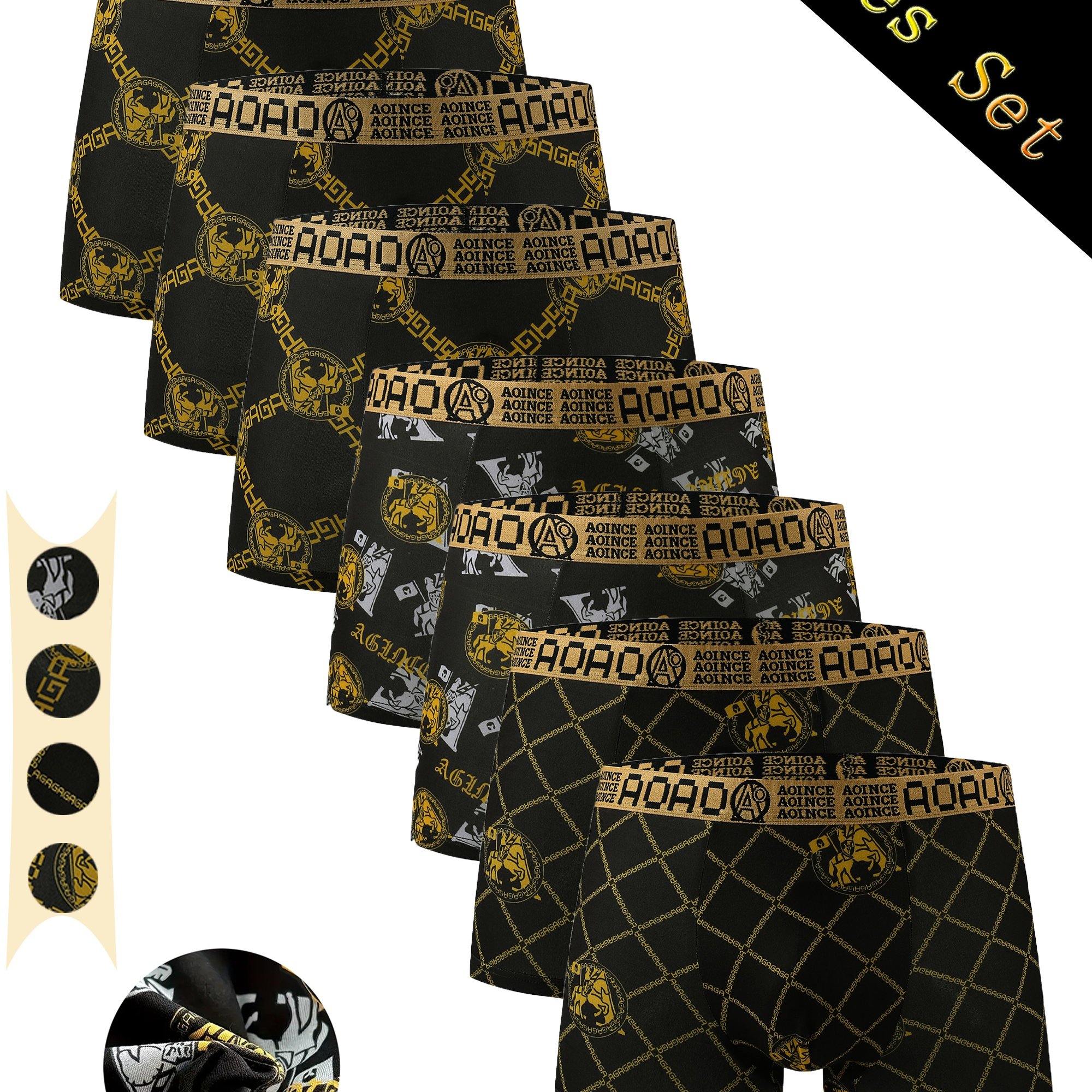 TEMU 남성용 고급스러운 블랙과 골드 박서 쇼츠 7피스 세트 - 편안하고 통기성 좋은, 멸균 처리된, 스타일리시한 기하학 패턴 디자인
