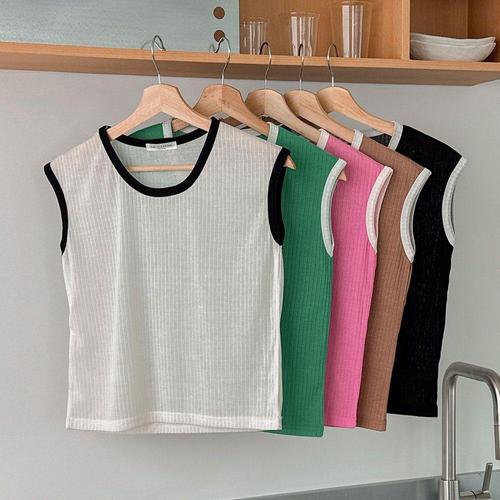 [옷자락]여성 여름 배색 골지 나시 라운드넥 캡소매 스판