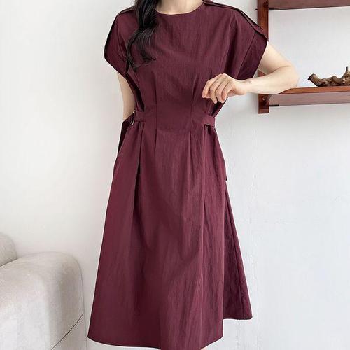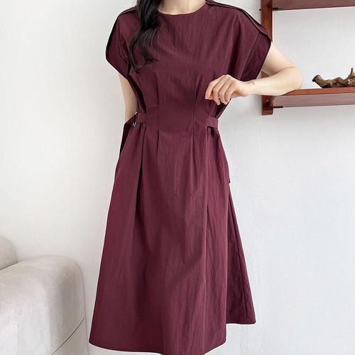 [옷자락]여자 나일론 와인원피스 핀턱 옆버클 캡소매 롱원피스
