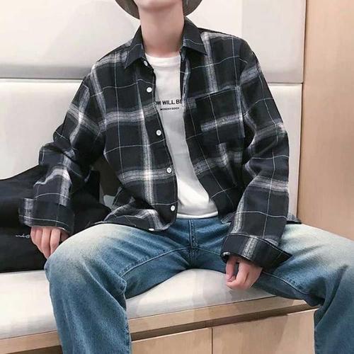 룽나루 남성용 가을 캐주얼 체크 셔츠 긴팔 커플 나염 HO3