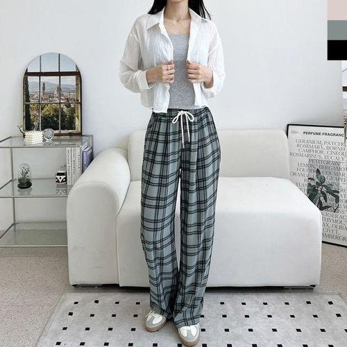 [에이치플러스몰]여성 여름 시원 쿨소재 체크 핀턱 와이드 밴딩 팬츠