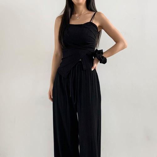 [신상오픈런]여성 셔링 크롭 끈 랩탑 나시 와이드 밴딩 팬츠 세트