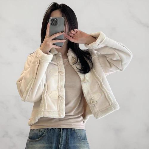 [디어로우]노에르 떡볶이버튼 양털 배색 크롭 무스탕