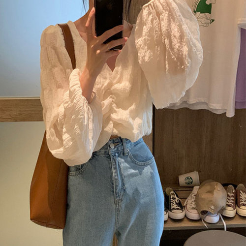 [신상오픈런]여성용 코튼 스퀘어넥 세미 크롭 긴팔 블라우스