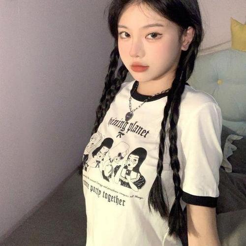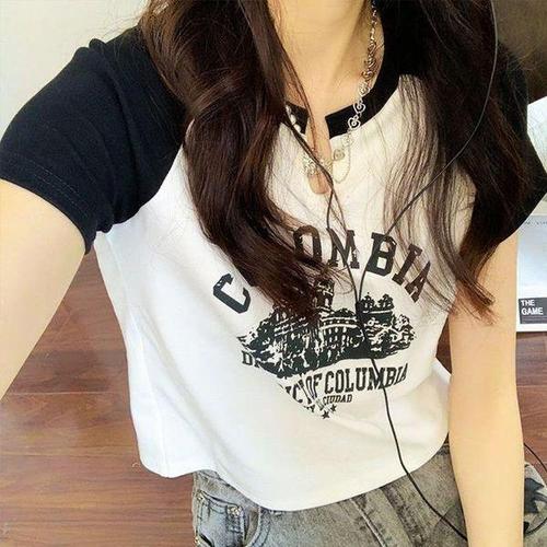 [셀러허브_여성트랜드패션]ONM 시크한 소녀 프린팅 배색 여름 반팔티셔츠 크롭티