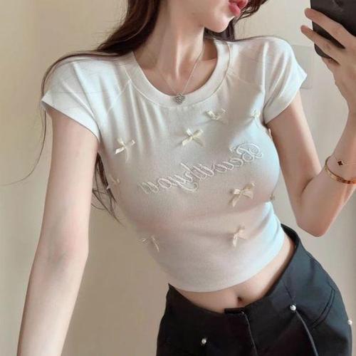 [에이치플러스몰]여성 여름 큐티 레터링 자수 리본 크롭 반팔티셔츠